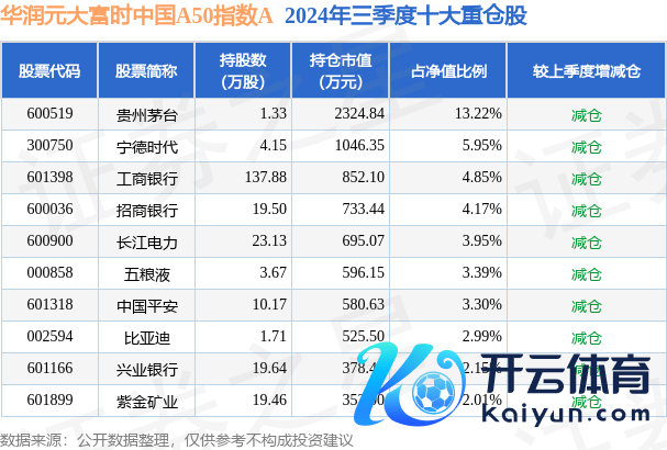 华润元大富时中国A50指数A为指数型-股票基金,凭据最新一期基金季报清晰,该基金金钱设立:股票占净值比91.56%,债券占净值比4.44%,现款占净值比6.26%。基金十大重仓股如下: